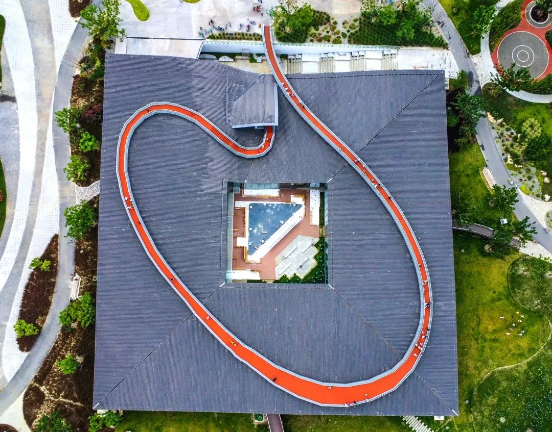 有了院子的建筑形态之后,设计师为了增加游客体验感,大胆突破传统建筑的边界,在屋顶加设了一条1.5米到3米不等“红色飘带”,从地面贯穿至整个屋面,随着屋顶的起伏而起伏,将游客动线从室内带到室外。而这个“红色飘带”,就是绿道。