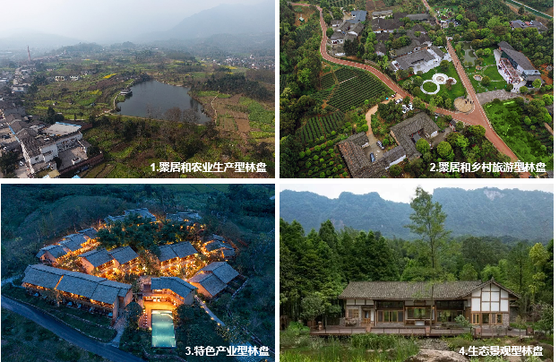 ▲ 川西林盘类型分类(川西林盘的四种类型分别是聚居和农业生产型林盘、聚居和乡村旅游型林盘、特色产业型林盘以及生态景观型林盘。)