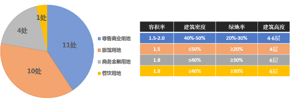 浙江省与海南省商业项目(商务金融用地除外)容积率、建筑高度、建筑密度的技术经济指标均普遍高于成都。容积率与建筑密度控制强度由低到高,基本呈现: 旅馆≤餐饮≤商务金融≤零售商业的特征。