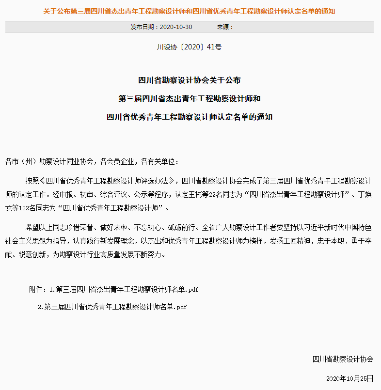 近日,四川省勘察设计协会公布第三届四川省杰出青年工程勘察设计师和四川省优秀青年工程勘察设计师认定名单,CDAD五位同志凭借多年过硬的专业技术素养和出色的表现在此次评选中脱颖而出,其中,陈乃志获评“四川省杰出青年工程勘察设计师”称号,丁焕龙、王巍、付安俊、何昕获评“四川省优秀青年工程勘察设计师”称号。