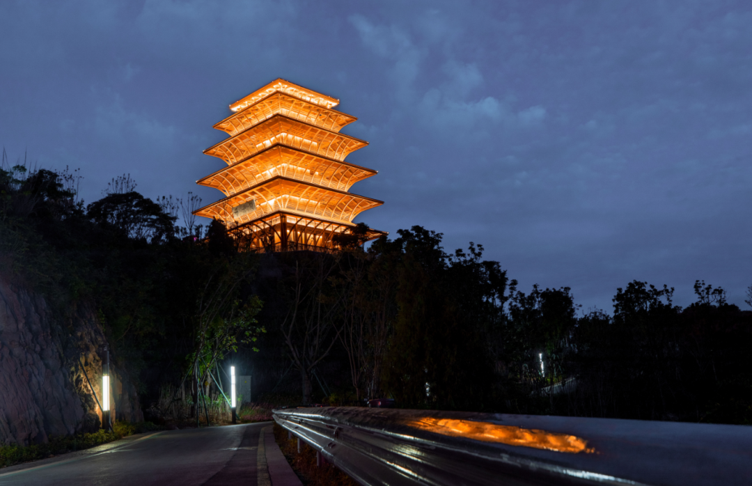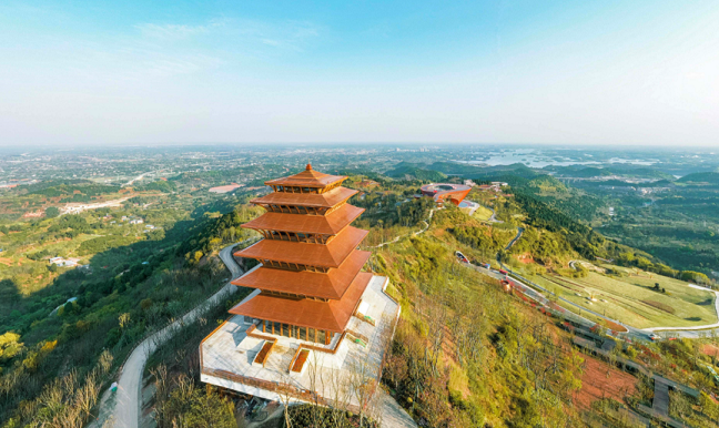 龙泉山丹景阁作为成都龙泉山城市森林公园第一个先导性、示范性、引领性项目,坐落于海拔737米丹景山顶,建筑主体高约39M,共5层。设计以现代手法演绎中国传统楼阁的经典形象,节节攀升、势如破竹的韵律美体现着成都公园城市示范区向上发展的力量与张力;传统与现代,古巴蜀与新天府在这里交织交融,见证新时代成都的永续发展,擘画出成都公园城市可持续发展、机遇无限的未来。