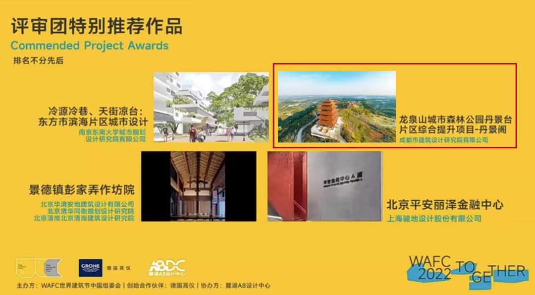 12月16日下午,2022 世界建筑节中国区(World Architecture Festival China,简称WAFC)正式公布获奖名单,市建筑院设计的龙泉山丹景阁项目脱颖而出,成功获得2022WAFC世界建筑节评审团特别推荐作品