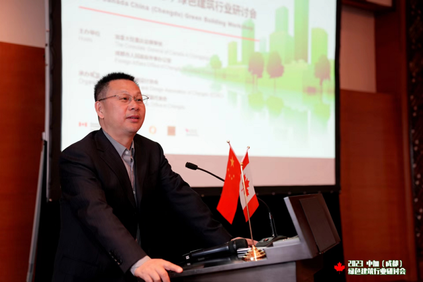 成都市勘察设计协会理事长、成都设计咨询集团副总经理徐军为大会做开场致辞,他表示:“希望通过本次研讨会,中加绿色建筑相关企业充分发挥自身优势、积极拓展业务模式、加大技术研发力度,加强中加绿色建筑行业的交流与合作。”
