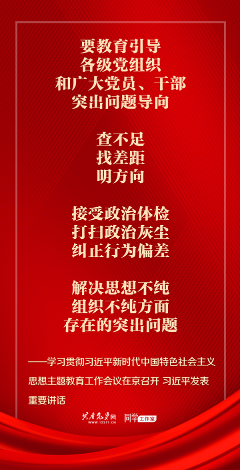 ●要教育引导各级党组织和广大党员、干部突出问题导向,查不足、找差距、明方向,接受政治体检,打扫政治灰尘,纠正行为偏差,解决思想不纯、组织不纯方面存在的突出问题,不断增强党的自我净化、自我完善、自我革新、自我提高能力,使我们党始终充满蓬勃生机和旺盛活力,始终成为中国特色社会主义事业的坚强领导核心。