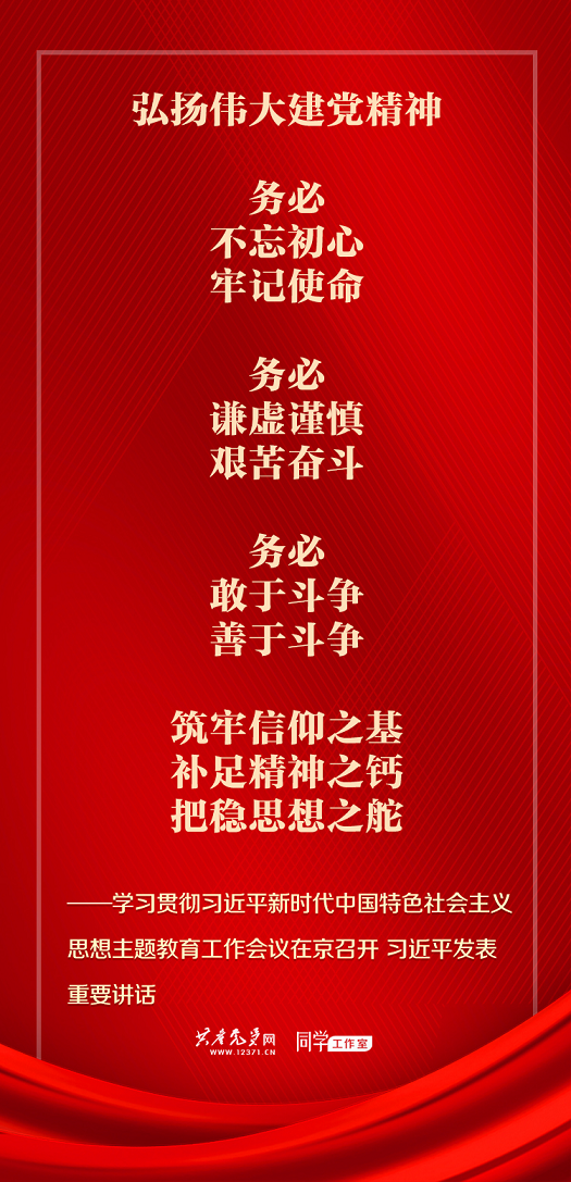 ●要凝心铸魂筑牢根本,教育引导广大党员、干部经受思想淬炼、精神洗礼,坚定对马克思主义的信仰、对中国特色社会主义的信念、对实现中华民族伟大复兴中国梦的信心,弘扬伟大建党精神,务必不忘初心、牢记使命,务必谦虚谨慎、艰苦奋斗,务必敢于斗争、善于斗争,筑牢信仰之基、补足精神之钙、把稳思想之舵。