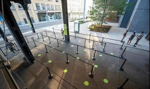 PENTAGRAM设计了一套环境图形,可帮助游客保持安全的社交距离。圆点结合景观设施的设置为社交距离划定了一个无形的屏障,形式新颖有吸引力。不会过分生硬却起到了提示和警醒的作用,该类设计可以利用在居民区活动区域或者跑道健身器材这类容易人群聚集的活动空间,以达到有效防疫的效果。