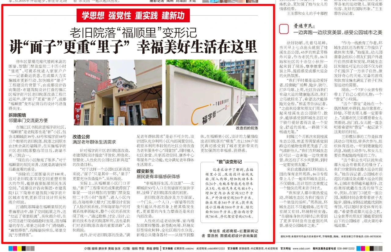 在成都大力实施城市更新行动、加快城市“里子”工程建设的背景下,由成都设计咨询集团·市建筑院设计打造的锦江区福字街片区老旧院落改造工程已近尾声。近日,成都商报对“福顺里”蝶变背后的设计巧思进行报道。
