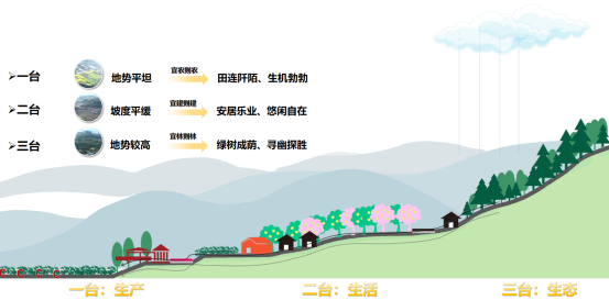 公园城市乡村表达的美学价值是乡村资源要素有效汇聚、协同作用、价值创造的系统集成,是居民们文化认同、美学价值、美好生活的关系网络,具体应体现在公园形态与三大要素的有机结合——以简阳独特的三台式自然丘陵形态特征为基底,结合农业产业和乡村建筑的表达,构建全新的丘区生产、生活、生态模式,展现简阳式特色丘区的乡村美学形态表达。