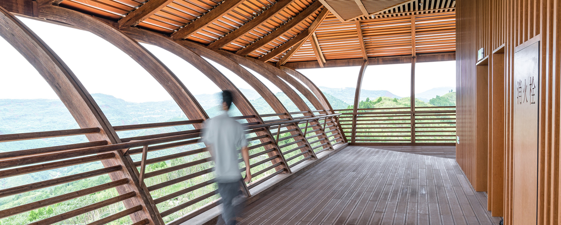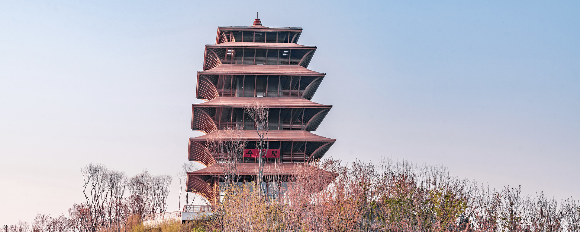 该项目是龙泉山城市森林公园第一个先导性、示范性、引领性项目。丹景阁坐落于海拔737米的丹景山高处,是丹景台景区核心区的制高点。 独特的地理位置,赋予建筑特有的气质。丹景阁观光塔,共五层,建筑含构架约39M,设计将中国传统空间结合四川传统林盘提炼植入丹景台景区,将中国传统楼阁式塔和密檐式塔元素进行提炼融合,融合密檐塔的挑檐典型特征,将楼层单元演绎为竹节状弧形支撑,体现向上发展的力量感与张力感,充分体现四川传统竹文化、天府文化。