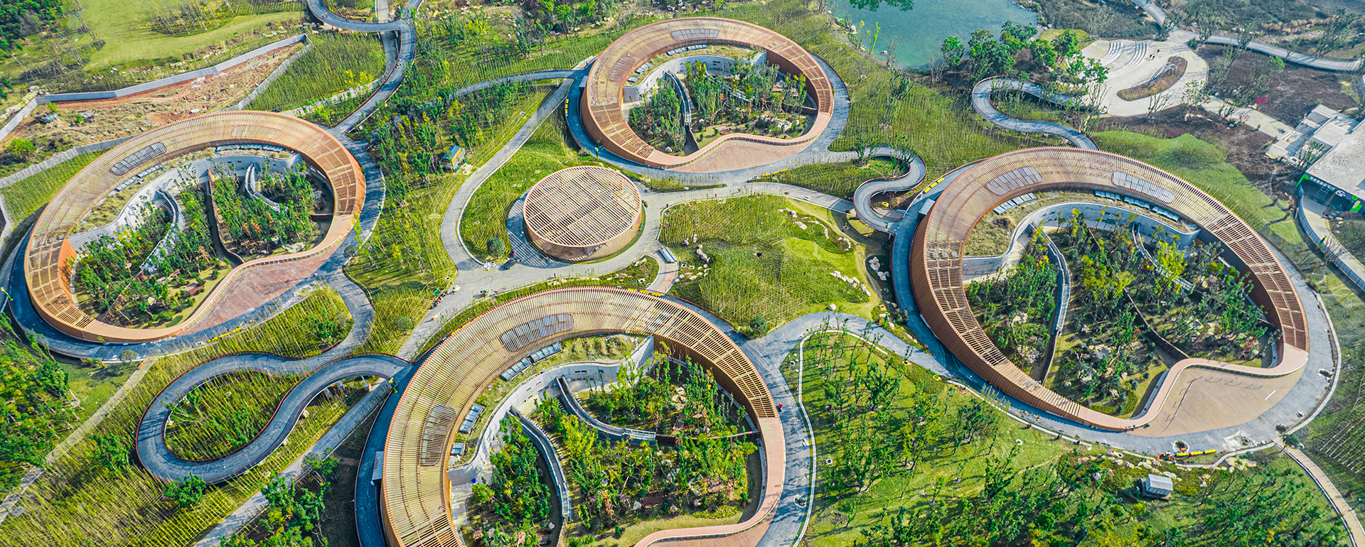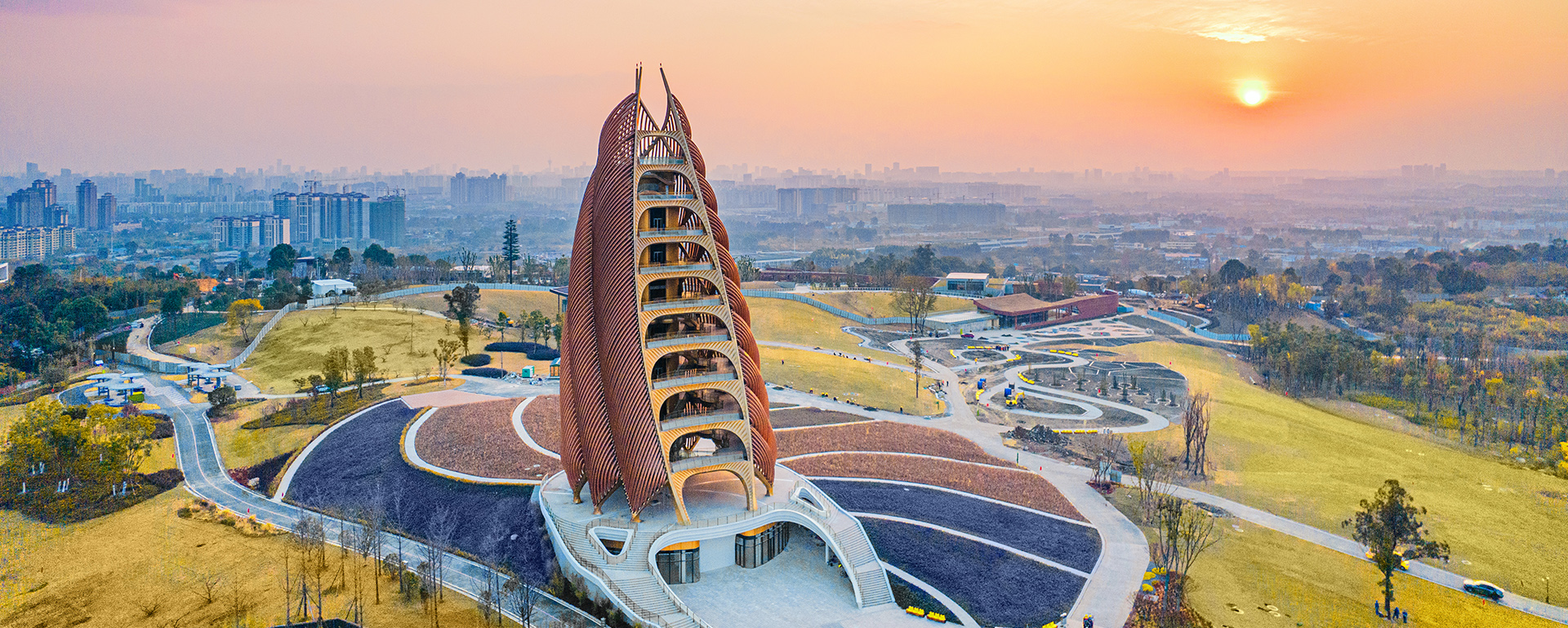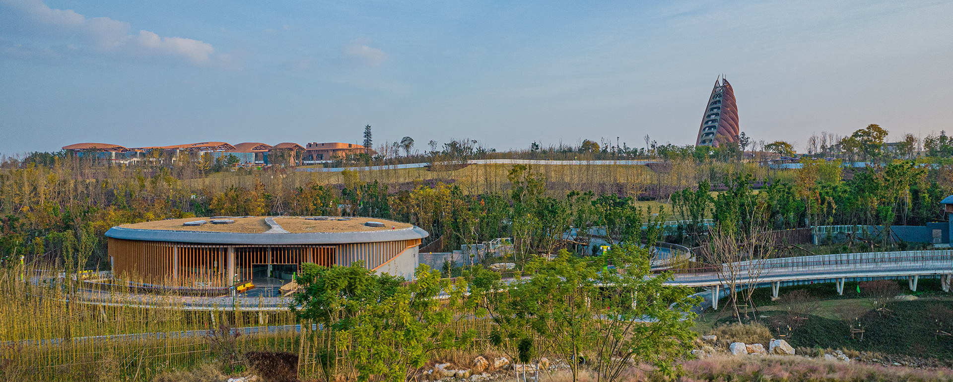 熊猫基地由原来的1035亩,扩建至3570亩,以尊重、保护、环境、互动、教育为设计原则,打造出一座动物友好、游客畅行,兼具科研科普功能的沉浸式熊猫乐园,对大熊猫及其伴生动物的科研工作有着重大意义。二期根据基地内自然地貌特征,结合大熊猫的生理习性,将基地划分成探索密林、冒险溪谷、无限山丘、英雄农场以及科学珍探五大片区,每个片区拥有不同类型的自然空间主题,为大熊猫提供丰富多样的生活环境。