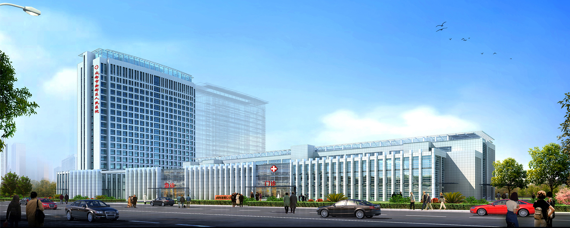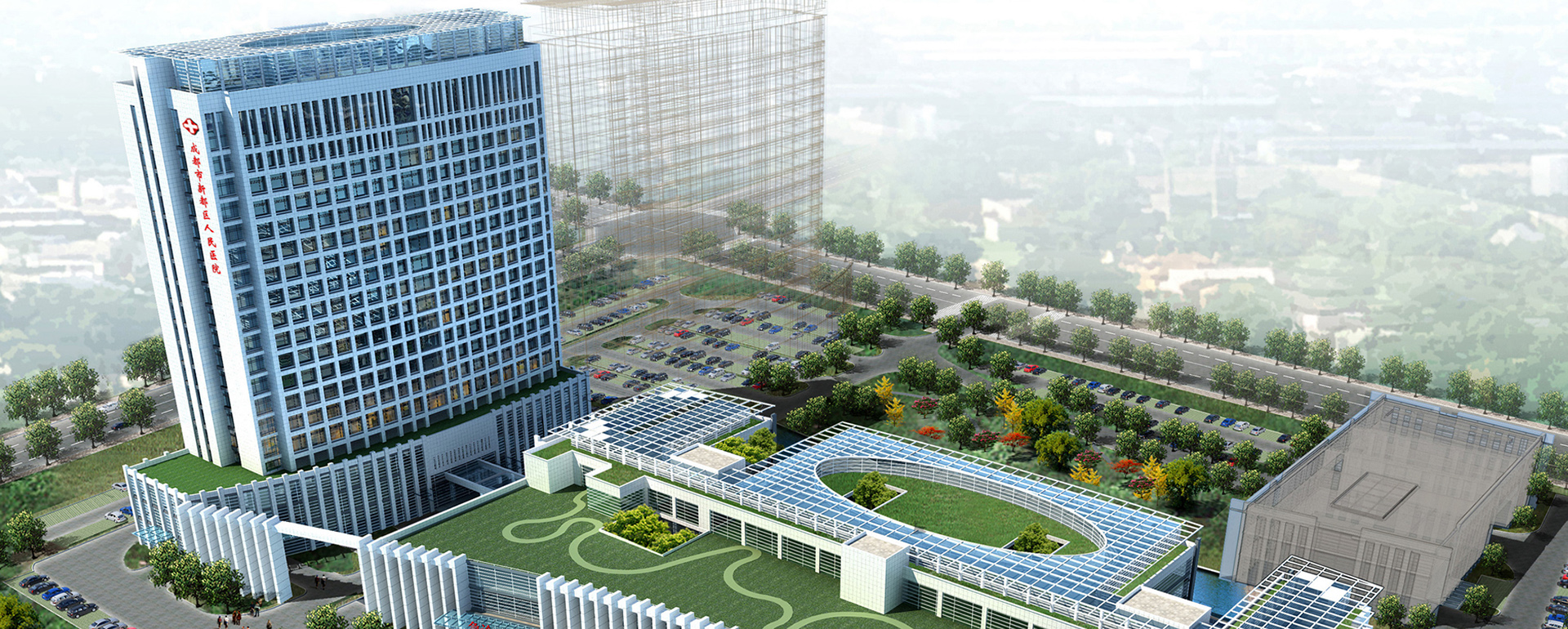 该项目位于成都市新都区翠微湖片区,定位为700床的大型现代化综合性三甲医院,为承担全区医疗、教学、科研、预防保健、中西医治疗、康复、技术培训为一体的综合性医疗机构。设计充分利用成都市得天独厚的资源,营造出独具特色的医院形象,形成具有绿色生态景观的医院,力求创造出设施一流、技术一流、管理一流、服务一流的与国际化医院相接轨的现代化医院。