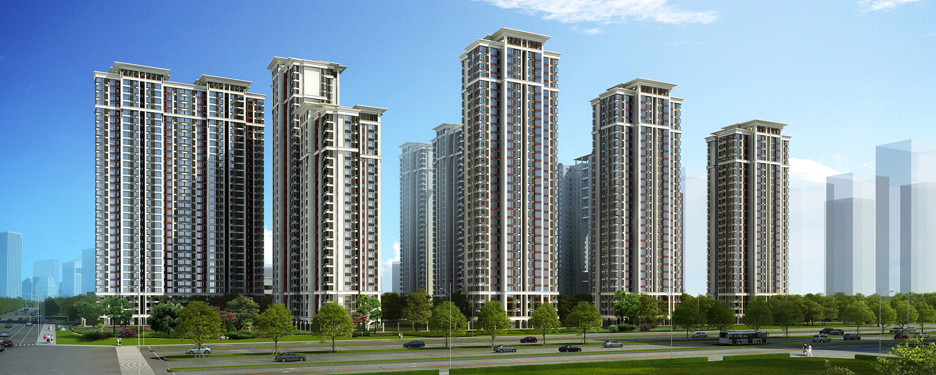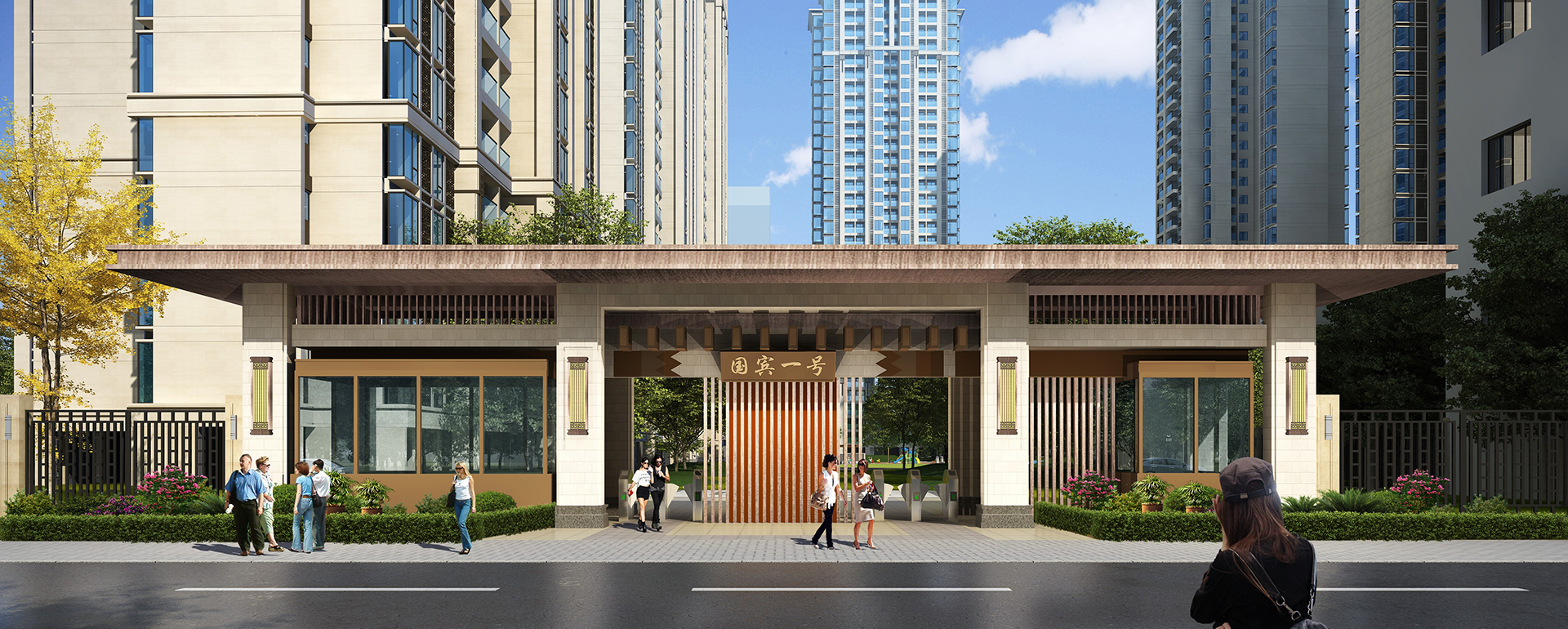 建筑群总体形态由10栋住宅与1栋办公楼围合而成,城市天际线呈现出南高北低,外密内疏的空间形态,沿三环路,形成整齐而有韵律的错落天际线。为体现区域的历史内涵,建筑风格采用现代中式,阙与飞檐的造型意境,成为片区的天际标识。
