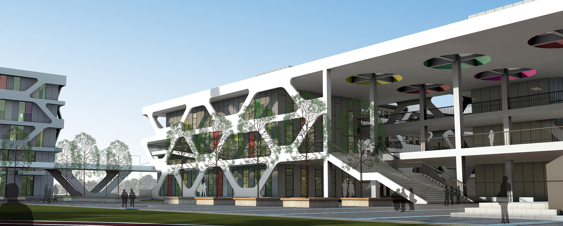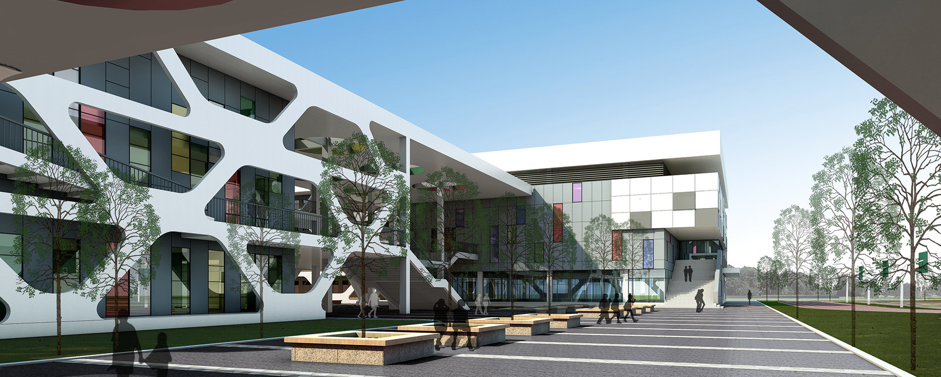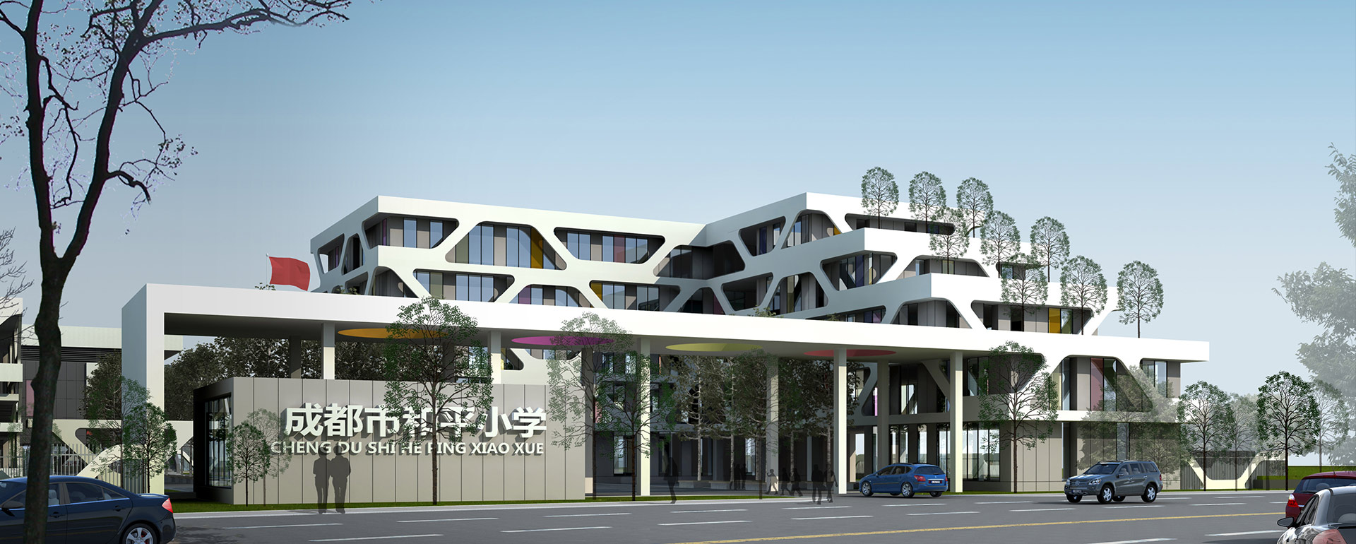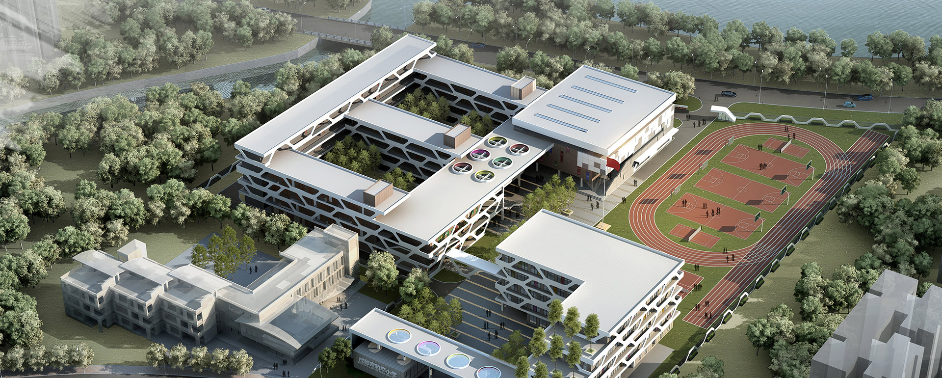 将常规单调的教室外柱廊受力构件转换为网络状造型,形成丰富 的光影和独特新颖的立面效果,为师生营造出生动有趣的教学环境。强调小学校园建筑的活泼灵动和富于想象,使其成为城市中一处独特的景观节点。